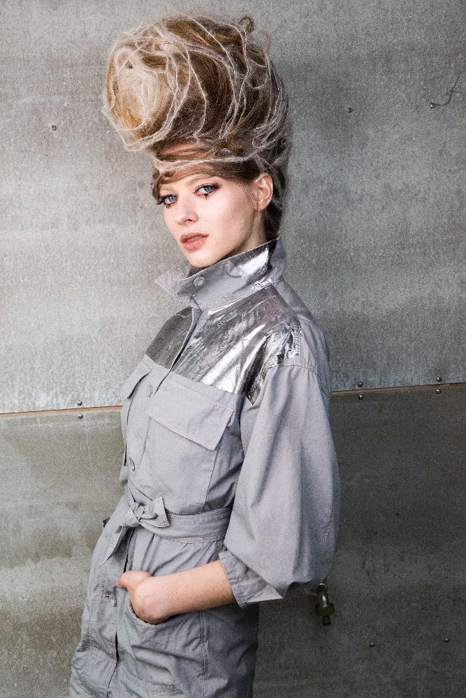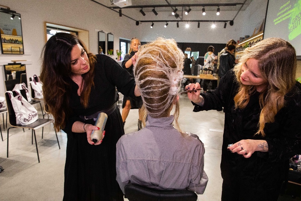 Přední česká kadeřnice Kateřina Holcknechtová a uznávaná makeupartistka a lektorka Make-Up institute Prague Zuzana Buriánková v rámci prezentace udržitelných produktů vytvořili na modelce netradiční look, který dobře koresponduje s udržitelnou módou světově uznávaného módního návrháře Jakuba Polanky. / foto: Davines